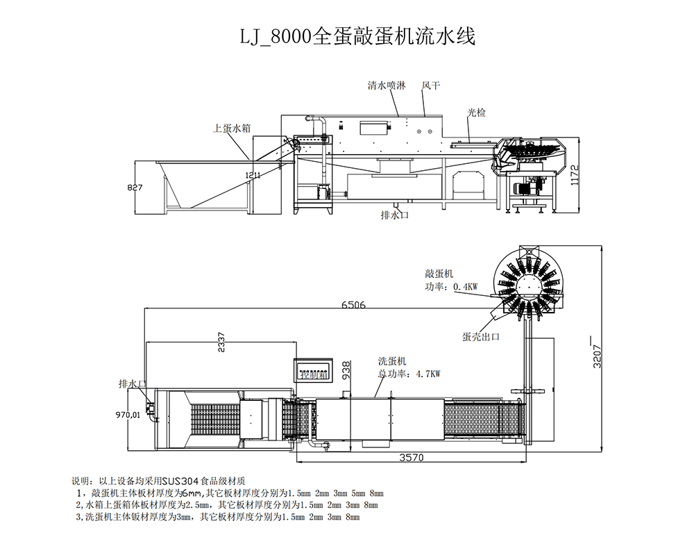 1. 设备型号与参数 LJ-QQ8生产线包含上蛋水箱 ,清洗风干(光检) ,18爪全蛋液敲蛋机组成的生产线,其主要技术参数如下: 最大处理量:8000枚/小时 电源:380V/50Hz 功率:8kW 外形...